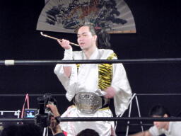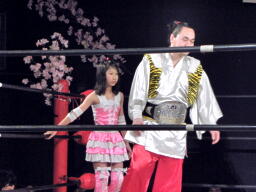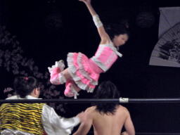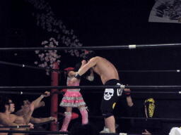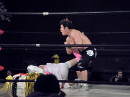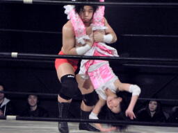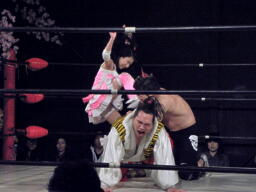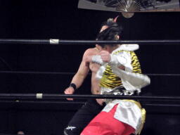 ロープに飛ぶ、おふうくるくるリボン(右写真)、カウント2。慶次郎にタッチ。