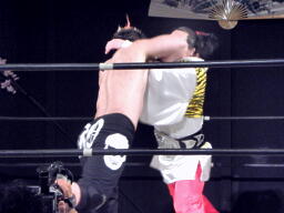 竹田ロープに飛んでギロチンドロップ(右写真)、カウント2。佐々木にタッチ。