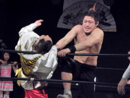 慶次郎ロープに振る、佐々木ブロックして慶次郎の髷をつかむ(左写真)。相撲だと反則負け。