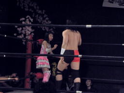 竹田張り手(左写真)、ニーリフト、カウント2。竹田裏投げ、おふうがカット。