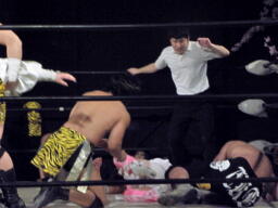 両陣営が入り乱れての乱闘になり(左写真)てっしー手島レフェリーは無効試合を宣告。