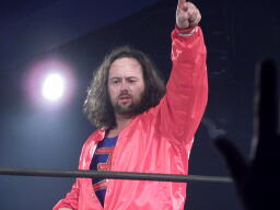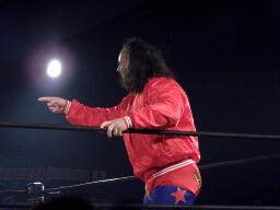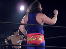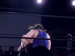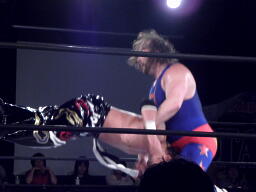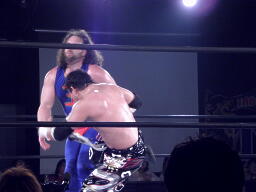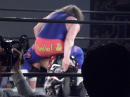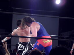 ユージンロープに振ってカニばさみ、馬乗りになってお尻ペンペン(右写真)。ユージンロープに飛ぶ、TAJIRIトラースキック、カウント2。5分経過。