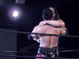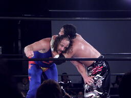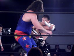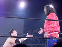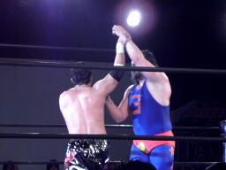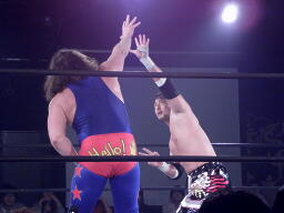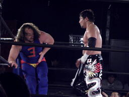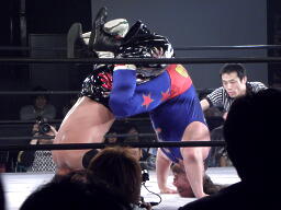 ユージンロープに振る、TAJIRIショルダーブロック(右写真)。TAJIRIロープに飛ぶ、ユージンヒップトス、TAJIRIモンキーフリップに切り返す、ユージン着地。
