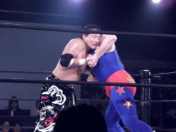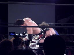 TAJIRIモンキーフリップ(右写真)、ユージンすぐに起き上がり上になったTAJIRIにボディシザーズ、TAJIRIはレッグロックに。