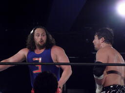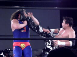 TAJIRIロープに振る、ユージン切り返すがTAJIRIはニールキック(右写真)、カウント2。
