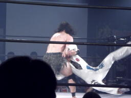 ヘイモロープに振る、TAJIRI切り返して低空ドロップキック(左写真)、ローキック連打。