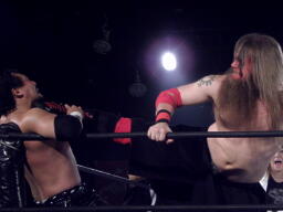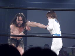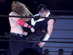 ロックアップ、ヘイモぶん投げる。再度ロックアップ、またヘイモぶん投げる。TAJIRIの背中にパンチ(右写真)。