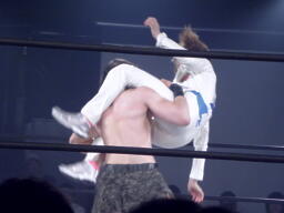 ヘイモがTAJIRIをボディスラム、スタークがカサドーラのようにヘイモに飛びつき、ヘイモがさらに持ち上げてTAJIRIの上に落とす(右写真)。
