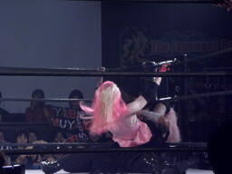 ジェシカはラリアットとエルボーでSMASHの3人をなぎ倒す。TAJIRIをロープに振ってコルバタ(左写真)、クロスボディ、カウント2。