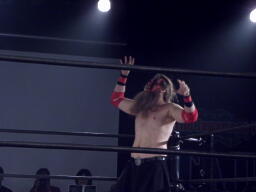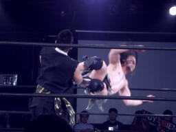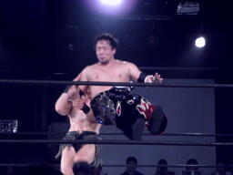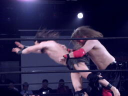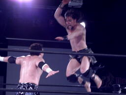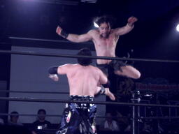 スタークロープに振る、TAJIRIハンドスプリングエルボー(右写真)、大原にタッチ。