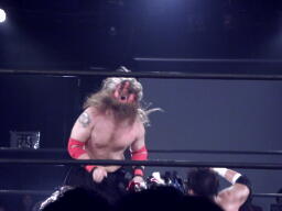 スタークコーナーに上っダイビングチョップ(左写真)、カウント2。ショルダークロー、TAJIRIはエビに丸め込む、カウント2。