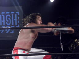大原ロープに飛ぶ、スターバックはカウンターのトラースキック(左写真)。ここまで結構重厚な動きを見せていたのがこの速さ。