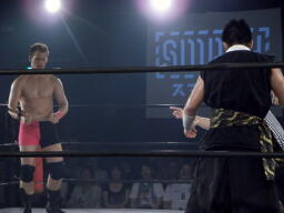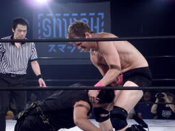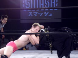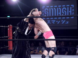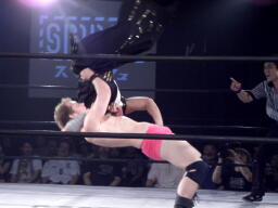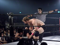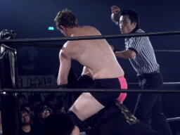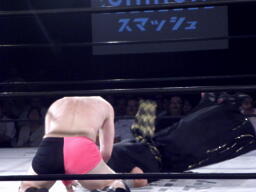 ヴァレンタインがネックブリーカー狙う、大原ブロックしてヘッドシザーズからフォール(左写真)、カウント2。
