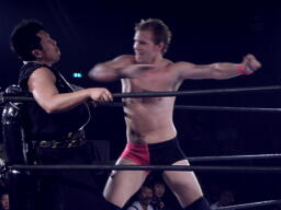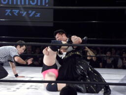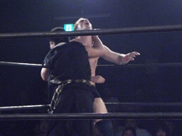 首をロープに引っ掛けてヒザで圧迫(右写真)。大原は場外に逃げるがヴァレンタインはエプロンからダブルアックスハンドル。