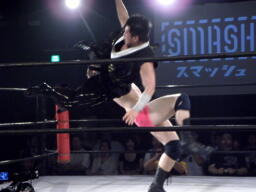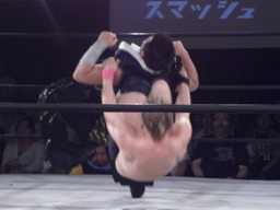 ヴァレンタインロープに飛ぶ、大原キャッチしてケブラドーラ・コン・ヒーロ。コーナーに振って串刺しラリアット(右写真)