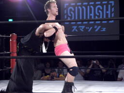 大原コーナーに詰める、ヴァレンタイン体勢入れ替えてバックハンドチョップ(右写真)。