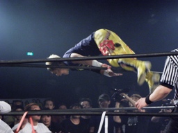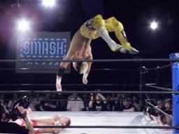 KUSHIDAコーナーに上ってムーンサルトプレス(右写真)、