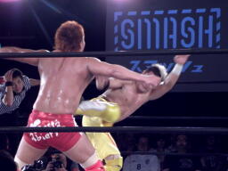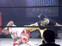内藤エルボー連打からローリングエルボー、KUSHIDAかわしてソバット(右写真)から首固め、カウント2。