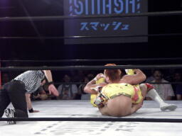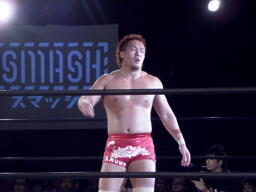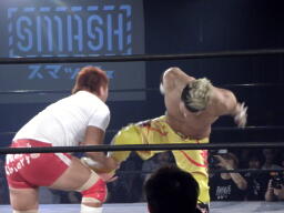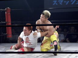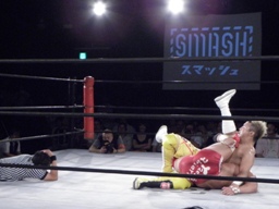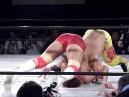 KUSHIDAロープに振る、内藤フライングエルボー(左写真)、バック取るとジャーマン、カウント2。