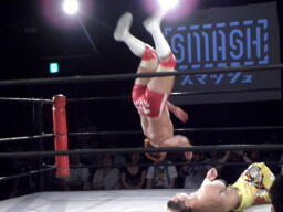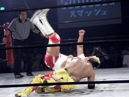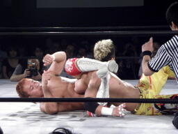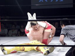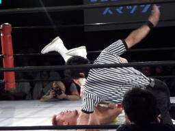 片エビに取るがレフェリーまだ立ち上がれない(左写真)。ようやくカウントいれるが2止まり。10分経過。