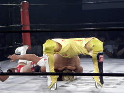 内藤ボディスラムからコーナーに上るとスターダストプレス(右写真)、これでカウント3。