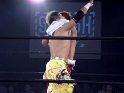 内藤ロープに振ってスパインバスター狙う、KUSHIDA切り返して飛びつきDDTに(左写真)。