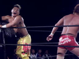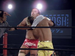 KUSHIDAロープに振る、内藤Tシャツを脱ぐとそれでKUSHIDAの首を絞める(右写真)。