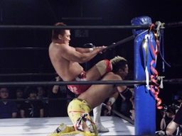 KUSHIDAはヒジでブレークすると内藤をターンバックルにぶつける(右写真)。