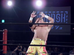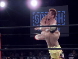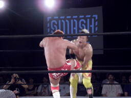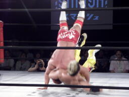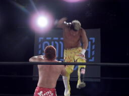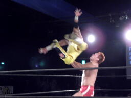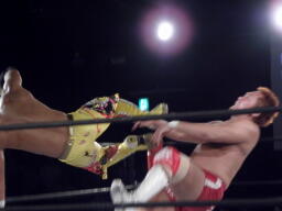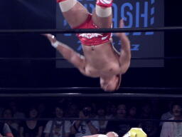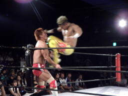 エルボーの打ち合い、KUSHIDAはバックエルボーで倒しエプロンにでるとスワンダイブ式のチョップ(右写真)。すかさずその場跳びムーンサルトプレス、カウント2。