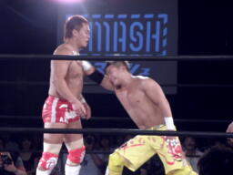 内藤ストンピング、KUSHIDAが立ち上がると逆水平(左写真)。