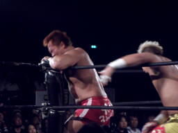 KUSHIDAエルボー(左写真)、内藤もエルボー。KUSHIDAローキック連打。