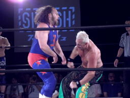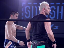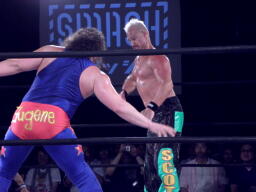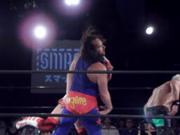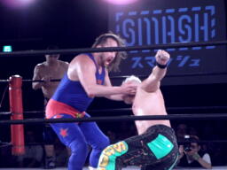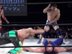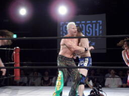 ユージンコーナーに振って突っ込む、TAKAカウンターのキック。再度突っ込む、TAKA再度キック、3度目は突進をかわしてスーパーK、スカリーにタッチ。再びスカリーとユージンの局面(右写真)。
