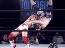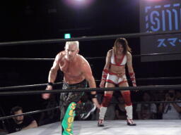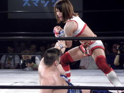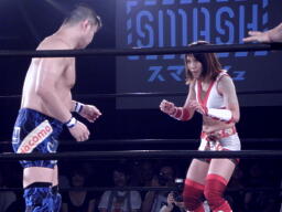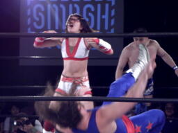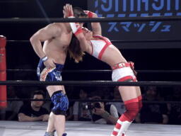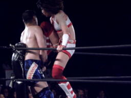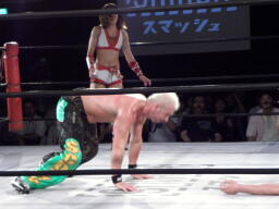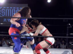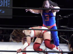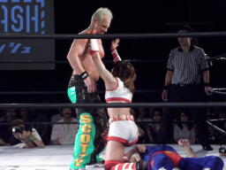 朱里ブレーンバスター、TAKAブロック。TAKA持ち上げる、朱里ブロックして投げる(右写真)、カウント2。10分経過。