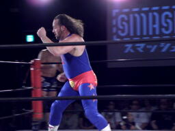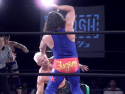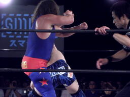 TAKAボディスラム狙うがユージンブロックしてコーナーに押し込みショルダータックル(右写真)、朱里にタッチ。