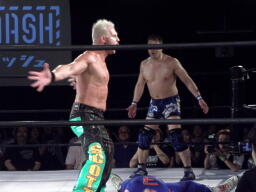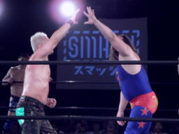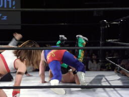スカリーがユージン、TAKAが朱里の頭をヘッドロックに捕らえてぶつけようとするが逆に同士討ちに(右写真)。