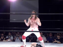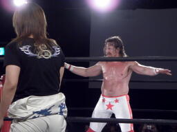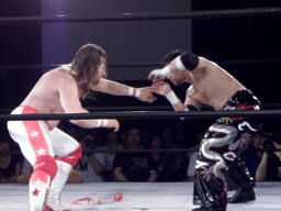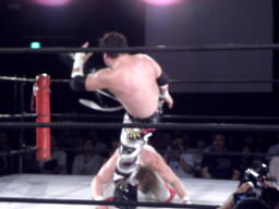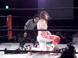 スターバックはTAJIRIを一旦ロープに乗せてブレーンバスター。TAJIRIは落とされた背中より足を気にする。スターバックナックルパンチ連打(左写真)、