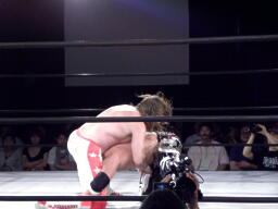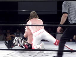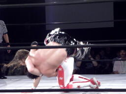 ロックアップでリスタート、スターバックバック取る、TAJIRI切り返すがスターバックは首投げからスリーパー(左写真)。
