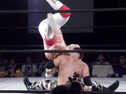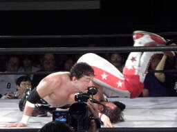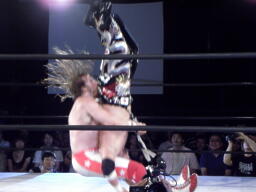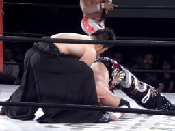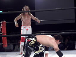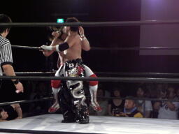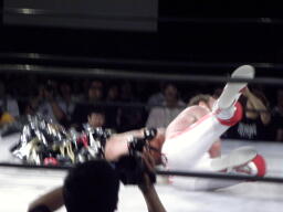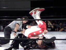 スターバックブレーンバスター狙う、TAJIRIブロックして十字架固め(右写真)、カウント2。首固め、これも2。