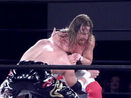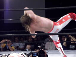ロックアップ、スターバックはヘッドロックからフライングメイヤー(右写真)。すぐに立ち上がる。