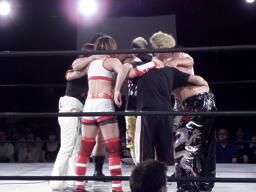 TAJIRI退場し残った人間で円陣を組んで結束を誓う(左写真)。