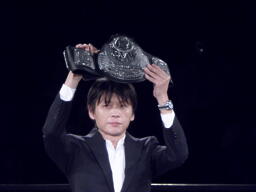 酒井代表がOVWのベルトを掲げる(左写真)。OVWヘビー級選手権が日本で行われるのは初めて。