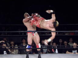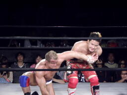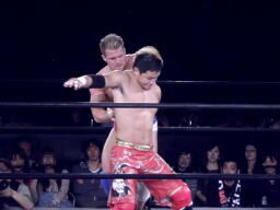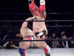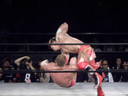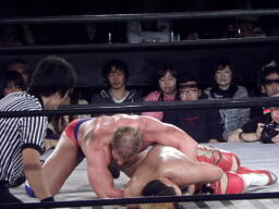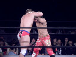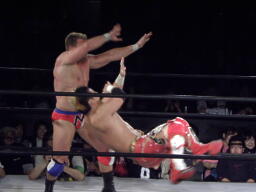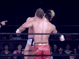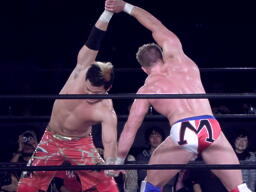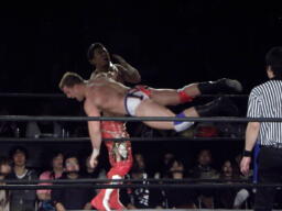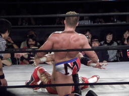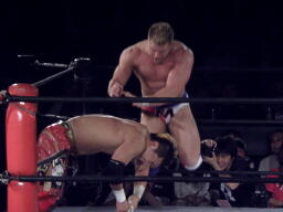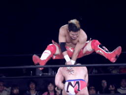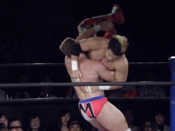 ロックアップ、モンドハンマーロック、KUSHIDA切り返してヒザ裏を蹴る。モンドヘッドロック、KUSHIDAロープに振る、モンドショルダーブロック。モンドロープに飛ぶ、KUSHIDAリープフロッグ(右写真)でかわし