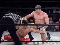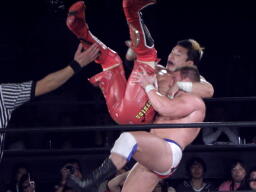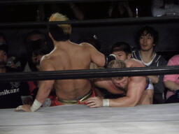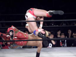 逆水平打ち込んでコーナーに振る、モンド切り返す、KUSHIDAエプロンに、モンドはエプロンのKUSHIDAにフライングラリアット(左写真)、KUSHIDA場外転落。5分経過。