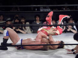 エビ固めに(左写真)、カウント2。もう一回、これもカウント2。