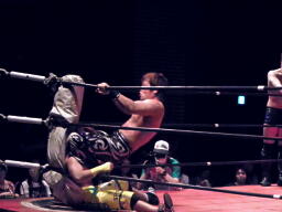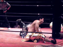 イトウ突っ込む、HARASHIMAはカニばさみで倒しトップロープ越えのギロチンドロップ(右写真)、カウント2。HARASHIMAコーナーに振る、イトウ切り返してヒザ蹴りからノーザンライトスープレックス、カウント2。イトウハイキック、HARASHIMAかわして水面蹴り。小林と忍にタッチ。