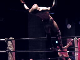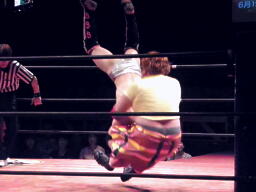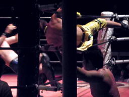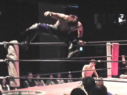 忍サトウにSEXボンバー、カウント2。S.E.X.狙ってコーナーに上る、イトウが雪崩式ブレーンバスター(左写真)。