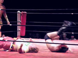 サトウと円華が入る、円華ミドルキック、サッカーボールキック、カウント2。ロープに振ってショルダースルー。ハイキックかわしてサトウジャンピングハイキック、ロープにもたれたところに619(右写真)、コーナーに上ってミサイルキック。