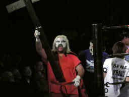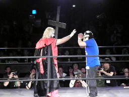 AC/DCの名曲「Hells Bells」で矢口様が十字架を掲げ入場(右写真)。