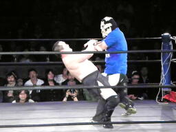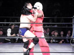 矢口がマントで大森の首を絞めて試合開始(右写真)。