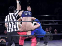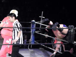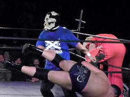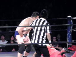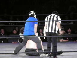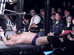 マーダラーは高智にショルダークロー(左写真)、金子レフェリーブレーク。